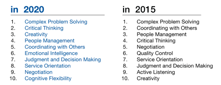 O World economic fórum publicou em seu portal (*) em 2016 um artigo interessante no qual destaca as competências e habilidades que seriam demandadas no futuro. Neste artigo, o futuro era o ano de 2020. Vejamos como isso evoluiu, e se evoluiu de fato.